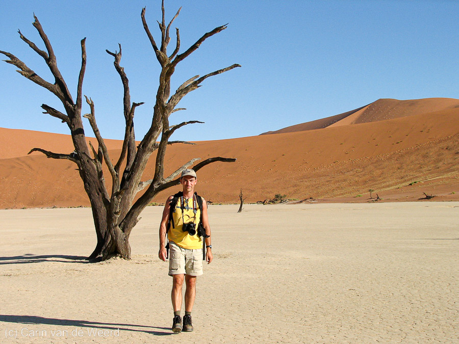 Rond 2 uur gaan we weer op pad. We laten ons door een 4WD taxi (100 N$ enkele reis; 180 N$ retour) afzetten bij de Sossusvlei. De weg daarheen is alleen begaanbaar met een 4WD. We lopen van Sossusvlei naar Deadvlei en dan weer terug naar de parkeerplaats. Al met al zo’n 6-7 km, wel allemaal door mul zand.
