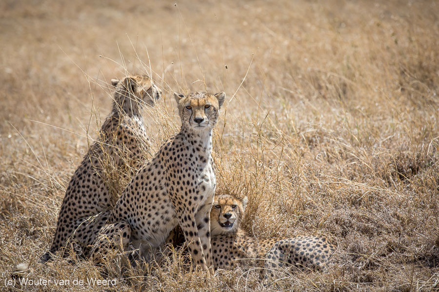 De tweede groep ligt met bebloede koppen in de schaduw van een klein boompje. Cornel ziet ze van ver en rijdt een stuk van de weg af zodat we ze van dichtbij kunnen zien. Zij hebben hun prooi (waarschijnlijk een kleine gazelle) laten afpakken door een groep leeuwen. Balen. Ze moeten er even van bijkomen.