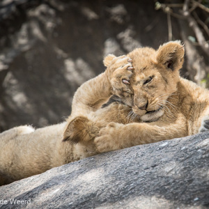 Het is zeer onwaarschijnlijk dat een leeuwin in haar eentje een zebra doodt. Op zoek naar de rest van de groep leeuwen, rijden we naar kopjes verderop. Ah … … daar ligt een andere leeuwin met vijf kleintjes! Ze zijn ongeveer 3-4 maanden oud. Een zesde kleintje ligt verderop in zijn eentje op een rots een tukje te doen. Dit blijkt een mannelijk jong te zijn. Mannetjes leeuwen zonderen zich al heel vroeg in hun leven af van de vrouwtjes. Het ziet er ongezellig en eenzaam uit.