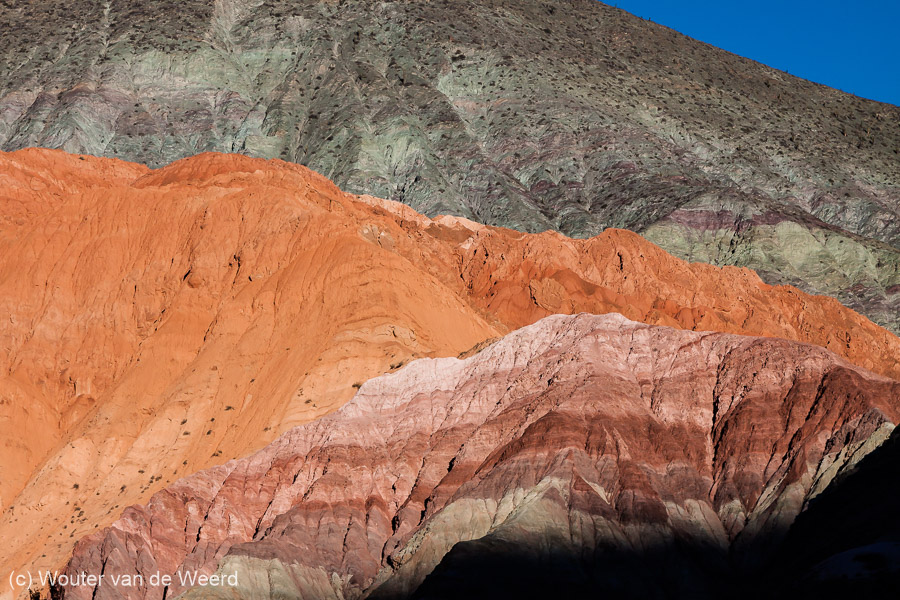 Ik ben gisteravond als een blok in slaap gevallen en ben nu lekker uitgeslapen. We kunnen hier vroeg ontbijten (half 8). We zijn op tijd opgestaan, want we willen de zeven kleurige bergen (Cerro de los Siete Colores) rond Purmamarca bij het ochtendlicht zien. Dat lukt ruimschoots. We zijn zelfs te vroeg. Purmamarca en de beroemde berg liggen nog vol in de schaduw als we arriveren. Wij proberen een plekje met een mooi uitzicht te vinden, wat niet meevalt met al die bovengrondse elektriciteitsdraden hier! Later zien we mensen op een heuveltje aan de rand van het dorp staan, pal voor de gekleurde bergen. Dat is dus ‘the place to be’. We lopen er ook heen, maar zijn voor het mooie licht eigenlijk al te laat. Op de heuvel spreek ik nog een Canadese. Zij vertelt trots dat zij als vrijwilliger heeft gewerkt tijdens de Olympische winterspelen deze winter bij het schaatsen. Ze heeft Sven Kramer de verkeerde wissel zien maken en Mark Tuitert Olympisch kampioen zien worden. Mazzelaar!