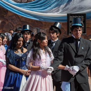 Als we in Humahuaca aankomen is er inderdaad wat te doen. Als we het dorp binnenrijden, lopen veel mensen in mooie kleren richting het centrum. We volgen deze stroom en komen zo op het centrale plein bij de ‘Iglesia de candelaria’ en de ‘Cabildo’. We zijn er toevallig om 11.55 uur en om 12 uur komt uit de ‘Cabildo’ (klokkentoren) een groot beeld van San Francisco Solano tevoorschijn om een zegening te geven. Het beeld schuift naar voren uit de muur en beweegt zijn hand met daarin een kruis. Het geheel wordt omlijst met kerkelijke muziek. Wat een spektakel! Het plein staat vol mensen die allemaal verwachtingsvol naar de klokkentoren kijken. In deze mensenmassa kan ik lekker met mijn zoomlens mooie mensen fotograferen. Door het klapbare schermpje kan ik het fototoestel op mijn heup houden en merken de mensen om mij heen niet op dat ik ze op de foto zet. Na de zegening lopen de meeste mensen naar grote trappen die aan het plein grenzen. De trappen leiden naar ‘Monumento a la Indepencia’. Bij het monument op de heuvel worden toespraken gehouden en zijn parades van militairen te zien. Ook worden er dansen uitgevoerd door mensen in traditionele kledij. Op de heuvel zien we ook de groepen gauchos weer terug. Zij vormen een halve cirkel om het plein. We kijken ons ogen uit! Het prettige is dat deze mensen zich speciaal voor de gelegenheid mooi hebben aangekleed en het ook leuk lijken te vinden om op de foto te gaan. Ik geneer me nog een beetje dat ik in Hollands oranje (fleecetrui) tussen de feestgangers foto’s sta te maken. Maar het lijkt de Argentijnen niets te kunnen schelen.