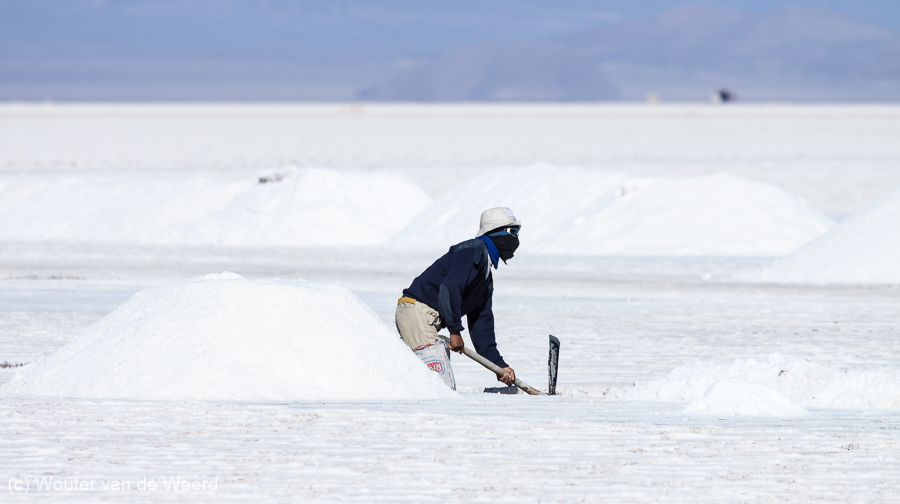 We hebben weer een mooie route vandaag. Het eerste deel van de reis, is het hoogteverschil het ‘hoogtepunt’. Dan komen we bij de ‘Salinas Grandes’. Dit is een enorme zoutvlakte van 12.000 hectare. Je kunt er met de auto op rijden. Het lijkt net alsof je op ijs rijdt. Ik verwacht te glijden en te slippen,maar dat doen we natuurlijk niet. Als je al dit zout hier ziet, kun je je niet meer voorstellen dat wij in Nederland afgelopen winter een zouttekort hadden; te weinig zout om de wegen tegen gladheid te strooien. Er wordt hier nog steeds zout gewonnen. Er zijn mannen zout aan het scheppen uit vierkant uitgesneden/uitgezaagde bakken. Ze zijn helemaal ingepakt en lijken op struikrovers in vermomming of bankovervallers die onherkenbaar willen zijn voor de beveiligingscamera’s. Ook deze mannen willen niet gefotografeerd worden. In de vierkant uitgehakte bakken staat water, waarin door de zon het zout kristalliseert en vervolgens door de mannen er uit wordt geschept. Zwaar werk, zeker in deze omstandigheden.